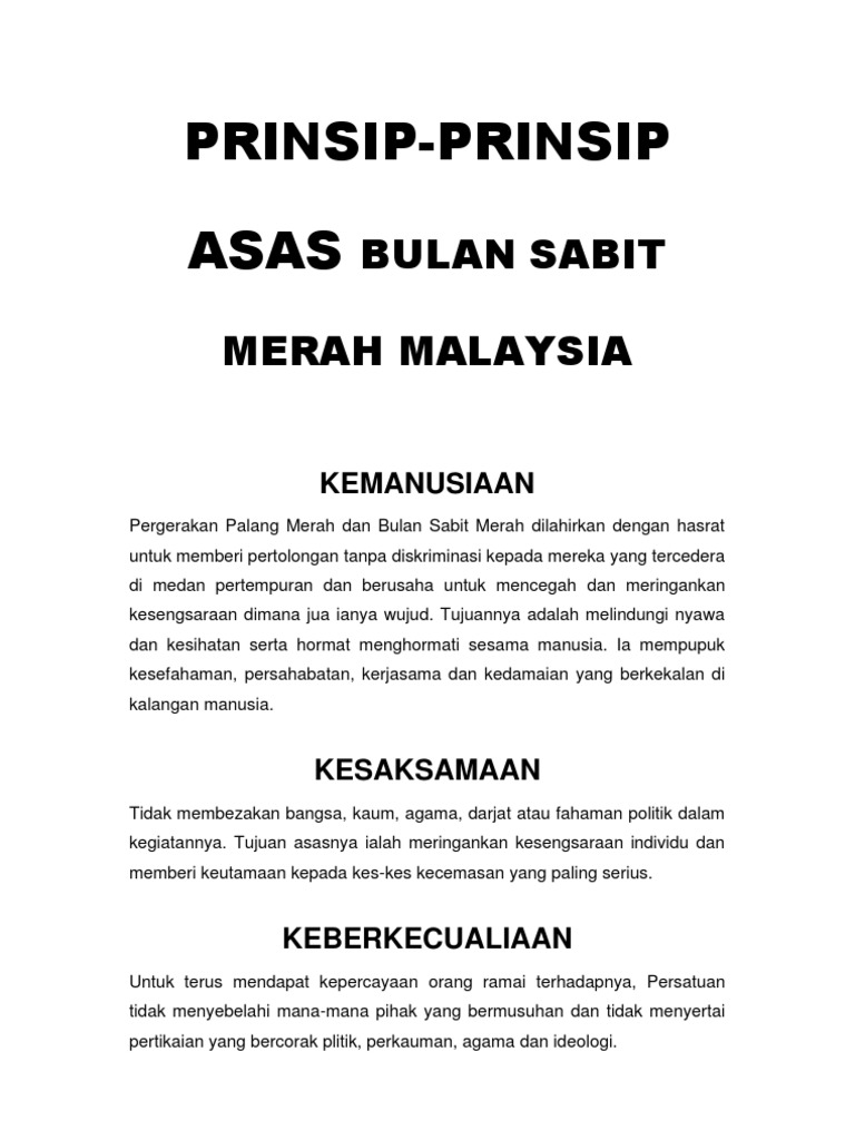 Web 7 prinsip dasar palangmerah internasional dan bulan sabit merah internasional Kemanusiaan Gerakan Palang Merah dan Bulan sabit Merah Internasional didirikan berdasarkan keinginan memberi pertolongan tanpa membedakan korban yang terluka di dalam pertempuran mencegah dan mengatasi penderitaan sesama manusia. Web Prinsip pertubuhan asas bulan sabit merah malaysia ialah seperti berikut.